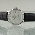 Zegarek marki Orient ma stal chirurgiczna kopertę 38 mm średnicy i jest wyposażony w pasek z materiału skóra.