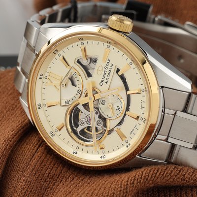 Orient Star Modern Skeleton Automatic jest częścią kolekcji Contemporary. Wprowadzony na rynek w 2014 roku stał się bestsellerem na całym świecie od czasu jego premiery w 2014 roku. Najnowsze dodatki do rodziny charakteryzują się kolorami tarczy, które uzupełniają metaliczne tekstury koperty i innych części zegarka, które są widoczne przez sprytnie umieszczone otwory w tarczy. Obok okien do wnętrza zegarka znajduje się wskaźnik rezerwy chodu na godzinie 12 i mała tarcza sekundowa na godzinie 6. Zegarek jest napędzany mechanicznym kalibrem F6F44 oferującym stabilną dokładność od +25 sekund do 15 sekund dziennie i rezerwę chodu wynoszącą 50 godzin. Wizualna harmonia między tarczą a mechanicznym mechanizmem pod spodem tworzy tarczę zegarka, która jest zarówno praktyczna, jak i intrygująca; Idealny dla mężczyzny, który ceni sobie dbałość o szczegóły i technologię.
