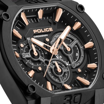 Zegarek marki Police ma stal chirurgiczna kopertę 45 mm średnicy i jest wyposażony w pasek z materiału skóra. Wewnątrz koperty jest mechanizm Seiko Instruments Inc. i zegarek ma także szkiełko Mineralny.