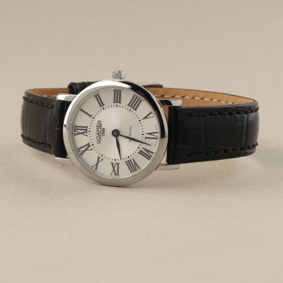 Zegarek marki Roamer ma stal chirurgiczna kopertę 28 mm średnicy i jest wyposażony w pasek z materiału skóra. Wewnątrz koperty jest mechanizm Ronda i zegarek ma także szkiełko Sapphire.