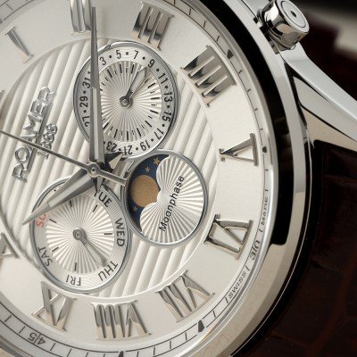 Zegarek marki Roamer ma stal chirurgiczna kopertę 43 mm średnicy i jest wyposażony w pasek z materiału skóra. Wewnątrz koperty jest mechanizm Ronda i zegarek ma także szkiełko Sapphire.