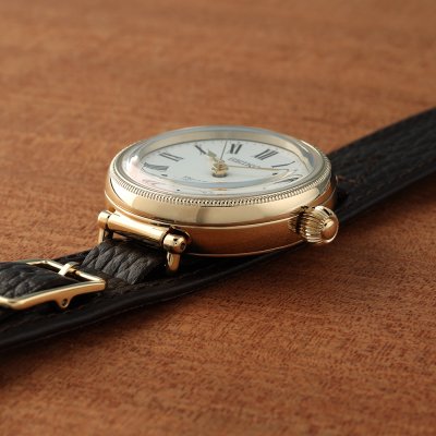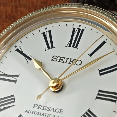 Aby uczcić 145. rocznicę powstania, Seiko wypuściło ten piękny zegarek Presage, inspirowany klasycznym zegarkiem kieszonkowym Seiko o nazwie "Timekeeper type 17". Jest to zegarek z limitowanej edycji ze złotymi akcentami, celebrujący wzbogacanie życia przez Seiko radością i pięknem. Podobnie jak zegarek kieszonkowy, ma koronkę w kształcie cebuli i ramkę ozdobioną skomplikowanymi detalami, aby odzwierciedlić sylwetkę historycznego zegarka. I podobnie jak oryginał, zegarek ten posiada ręcznie wykonaną tarczę z białej emalii, której nierówna powierzchnia jest wyjątkowa, nie ma dwóch dokładnie takich samych. Jest ona oznaczona klasycznymi cyframi rzymskimi zapewniającymi wysoką czytelność, a kryształ w kształcie pudełka dodaje głębi projektowi. Jako członek Leather Working Group (LWG) Seiko pozyskało pasek ze zrównoważonej garbarni z certyfikatem LWG.