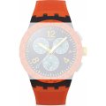 Zegarek marki Swatch ma Żywica kopertę 41 mm średnicy i jest wyposażony w pasek z materiału guma. Wewnątrz koperty jest mechanizm ETA i zegarek ma także szkiełko Akryl.