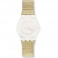 Pasek do zegarka Swatch jest wykonany z materiału stal nierdzewna i jest zamocowany do zegarka za pomocą… stalowe sworznie. Ten pasek ma szerokość 17 mm. Ten pasek nie ma prostego mocowania, co oznacza, że pasuje wyłącznie do zegarków z poniższej listy.