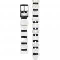 Pasek do zegarka Swatch jest wykonany z materiału silikonowo i jest zamocowany do zegarka za pomocą… stalowe sworznie. Ten pasek ma szerokość 12 mm i zamyka się za pomocą sprzączka. Ten pasek nie ma prostego mocowania, co oznacza, że pasuje wyłącznie do zegarków z poniższej listy.