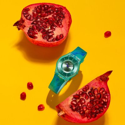 Zegarek marki Swatch ma Tworzywa sztuczne pochodzenia biologicznego kopertę 33.7 mm średnicy i jest wyposażony w pasek z materiału guma. Wewnątrz koperty jest mechanizm ETA i zegarek ma także szkiełko Akryl.