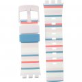 Pasek do zegarka Swatch jest wykonany z materiału silikonowo i jest zamocowany do zegarka za pomocą… stalowe sworznie. Ten pasek ma szerokość 28 mm i zamyka się za pomocą sprzączka. Ten pasek nie ma prostego mocowania, co oznacza, że pasuje wyłącznie do zegarków z poniższej listy.