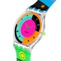 Zegarek marki Swatch ma Tworzywa sztuczne pochodzenia biologicznego kopertę 33.7 mm średnicy i jest wyposażony w pasek z materiału guma. Wewnątrz koperty jest mechanizm ETA i zegarek ma także szkiełko Akryl.