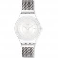 Pasek do zegarka Swatch jest wykonany z materiału stal nierdzewna i jest zamocowany do zegarka za pomocą… stalowe sworznie. Ten pasek ma szerokość 19.6 mm i zamyka się za pomocą nIewidoczne zapięcie motylkowe. Ten pasek nie ma prostego mocowania, co oznacza, że pasuje wyłącznie do zegarków z poniższej listy.