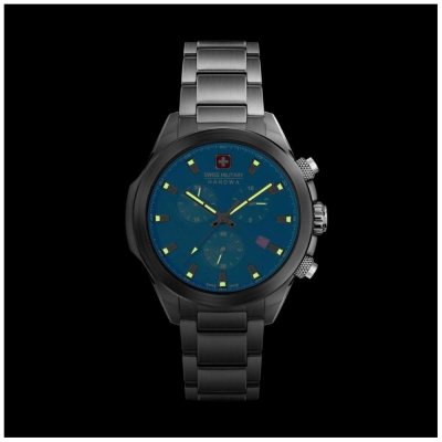 Zegarek marki Swiss Military Hanowa ma stal chirurgiczna kopertę 44 mm średnicy i jest wyposażony w pasek z materiału stal chirurgiczna. Wewnątrz koperty jest mechanizm Timex i zegarek ma także szkiełko Sapphire.