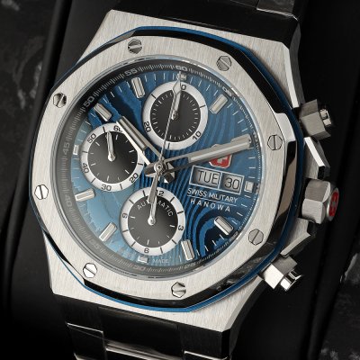 Zegarek marki Swiss Military Hanowa ma stal chirurgiczna kopertę 43 mm średnicy i jest wyposażony w pasek z materiału stal chirurgiczna. Wewnątrz koperty jest mechanizm ETA i zegarek ma także szkiełko Sapphire.