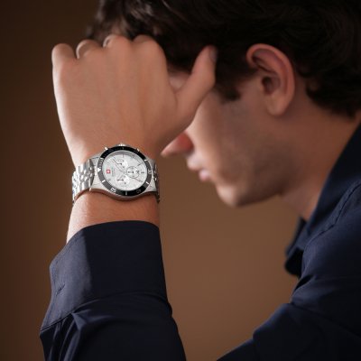 Zegarek marki Swiss Military Hanowa ma stal chirurgiczna kopertę 42 mm średnicy i jest wyposażony w pasek z materiału stal chirurgiczna. Wewnątrz koperty jest mechanizm Ronda i zegarek ma także szkiełko Sapphire.