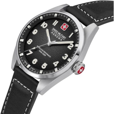Zegarek marki Swiss Military Hanowa ma stal chirurgiczna kopertę 42 mm średnicy i jest wyposażony w pasek z materiału skóra. Wewnątrz koperty jest mechanizm Ronda i zegarek ma także szkiełko Sapphire.