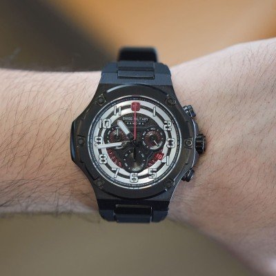 Zegarek marki Swiss Military Hanowa ma stal chirurgiczna kopertę 44 mm średnicy i jest wyposażony w pasek z materiału guma. Wewnątrz koperty jest mechanizm Ronda i zegarek ma także szkiełko Sapphire.