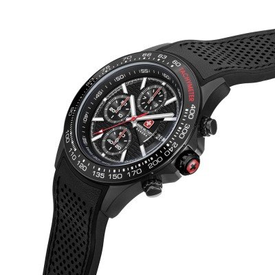 Zegarek marki Swiss Military Hanowa ma stal chirurgiczna kopertę 43 mm średnicy i jest wyposażony w pasek z materiału guma. Wewnątrz koperty jest mechanizm Ronda i zegarek ma także szkiełko Sapphire.