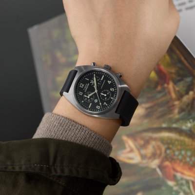 Zegarek marki Timex ma stal chirurgiczna kopertę 41 mm średnicy i jest wyposażony w pasek z materiału guma. Wewnątrz koperty jest mechanizm Timex i zegarek ma także szkiełko Mineralny.