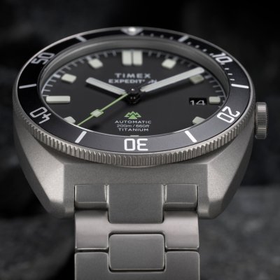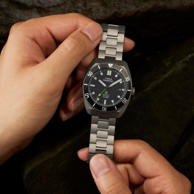 Zegarek marki Timex ma Tytan kopertę 41 mm średnicy i jest wyposażony w pasek z materiału Tytan. Wewnątrz koperty jest mechanizm Timex i zegarek ma także szkiełko Sapphire.