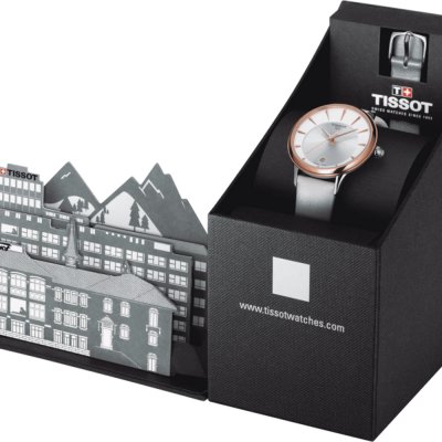 Zegarek marki Tissot ma stal chirurgiczna kopertę 33 mm średnicy i jest wyposażony w pasek z materiału skóra. Wewnątrz koperty jest mechanizm ETA i zegarek ma także szkiełko Sapphire.