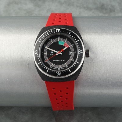 Zegarek marki Tissot ma Carbon kopertę 41 mm średnicy i jest wyposażony w pasek z materiału guma. Wewnątrz koperty jest mechanizm ETA i zegarek ma także szkiełko Pojedyncze szafirowe szkiełko anty-refleksyjne.