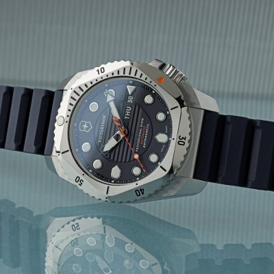 Zegarki kwarcowe Victorinox Dive Pro są dostępne zarówno w wersji stalowej, jak i tytanowej, a także z różnymi paskami, od jaskrawej gumy po praktyczny paracord. To, co je łączy, to potężny szwajcarski mechanizm kwarcowy Ronda, certyfikat ISO 6425, wodoodporność 30 ATM, jednokierunkowy obrotowy bezel oraz dobrze widoczne indeksy i wskazówki. Zegarek został zaprojektowany, wyprodukowany i przetestowany we własnej fabryce Victorinox w Delémont.