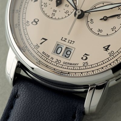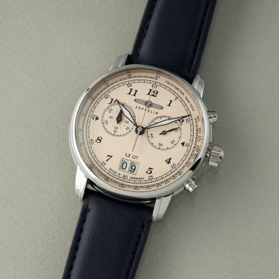 Zegarek marki Zeppelin ma stal chirurgiczna kopertę 40 mm średnicy i jest wyposażony w pasek z materiału Skóra wegańska. Wewnątrz koperty jest mechanizm Ronda i zegarek ma także szkiełko K1 Mineral.